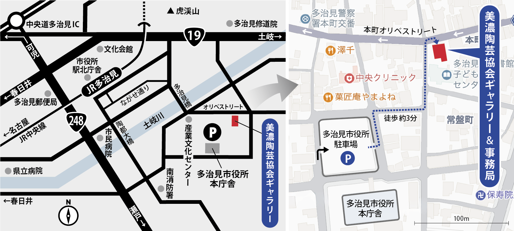 | 駐車場 | 多治見市役所本庁舎駐車場をご利用下さい。無料・徒歩約3分(多治見市日ノ出町2-15) |